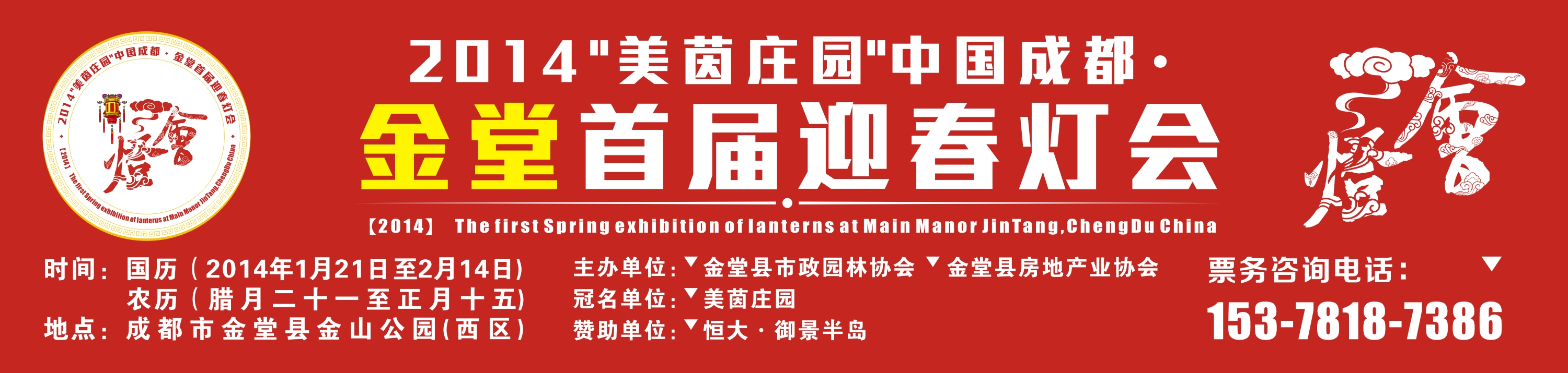 2014年1月21日由金堂县房地产业协会、金堂县市政园林协会联合主办的“2014‘美茵庄园’中国成都·金堂首届迎春灯会”在成都市金堂县金山公园隆重启幕,灯会将持续到2月14号。本届灯会将突显国际化和创新路线,采用LED环保节能灯具,现场规模宏大,灯组数高达40组,充分融合龙马元素和金堂水文化贯穿整个主题,打造一台既传统又现代和极具国际范儿的光影盛宴。
