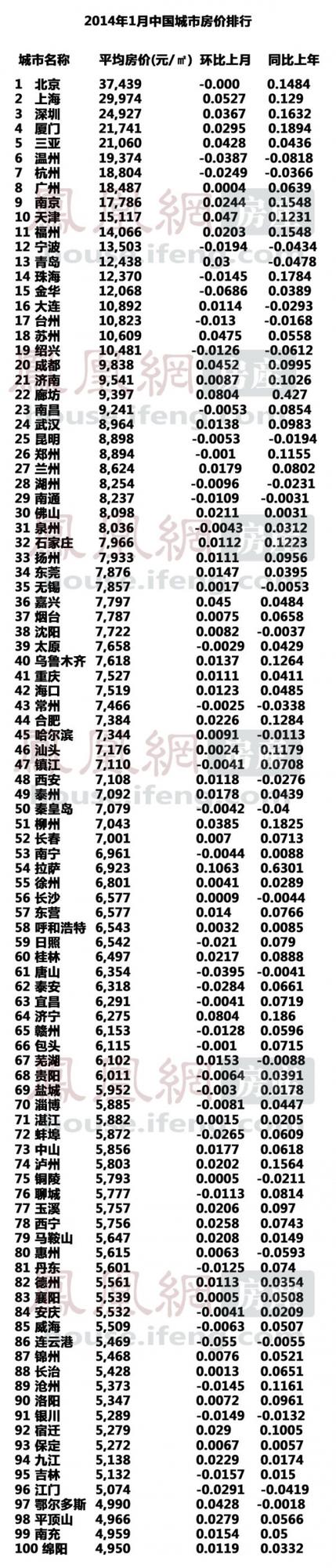 日前,全国房地产市场数据中心统计的《2014年1月全国城市房价排行榜前100名》火热出炉,1月全国城市房价排行榜前10名分别是北京、上海、深圳、厦门、三亚、温州、杭州、广州、南京、天津。