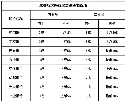 在走访调查中发现,目前成都各大银行在首套房的首付政策上,基本都是首付三成,然而对于房贷利率却各有不同,贷款利率在基准利率基础上,上浮从5%—10%不等。其中,农业银行、工商银行、交通银行、光大银行等银行最低上浮5%,成都银行的首套房贷利率则上浮6%。