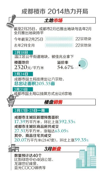 2月18日马年首拍推出的5宗地块中,温江区公平街道地块在三家房企的争夺中不断飚价,最终被佳兆业以楼面地价2320元/平方米拿下,溢价率54.67%。2月24日成都市国土局挂牌出让六宗地,总出让面积205.35亩,其中华府65亩商业地块溢价35%成交;紧接着2月25日,成都市国土局以挂牌方式出让六宗地,其中龙湖晋阳村再收36亩新地。“土地市场的活跃程度,直接可以预判出楼市未来的走势行情。”成都一代理机构的负责人说,今年开年以来,虽然唱空的声音很多,成都与一线城市相比还有极大的空间。楼市进入小阳春3月新盘至少40个