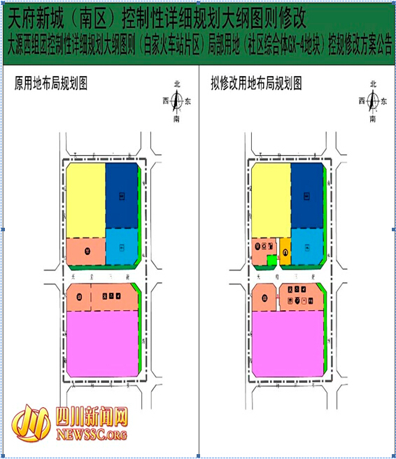 四川新闻网成都12月5日讯(记者 李丹)今日,成都市规划局公布了天府新城(南区)大源西组团控制性详细规划大纲图则(白家火车站片区)局部用地控规修改方案公告,拟对天府三街北侧原规划服务设施用地(农贸市场)以及天府三街南侧原规划服务设施用地进行修改。