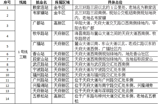 今年9月份成都市民政局公示的14座地铁1号线三期站名,分别为赖家店站(金牛区),、韦家碾站(金牛区)、广都站(高新区)、牧华路站(天府新区)、广福站(天府新区)、香山站(天府新区)、段家山站(天府新区)、武汉路站(天府新区)、宁波路站(天府新区)、福州路站(天府新区)、广州路站(天府新区)、兴隆湖站(天府新区)、天府新站(天府新区)和五根松站(高新区)。1号线三期将串联金牛区、天府新区以及高新区。