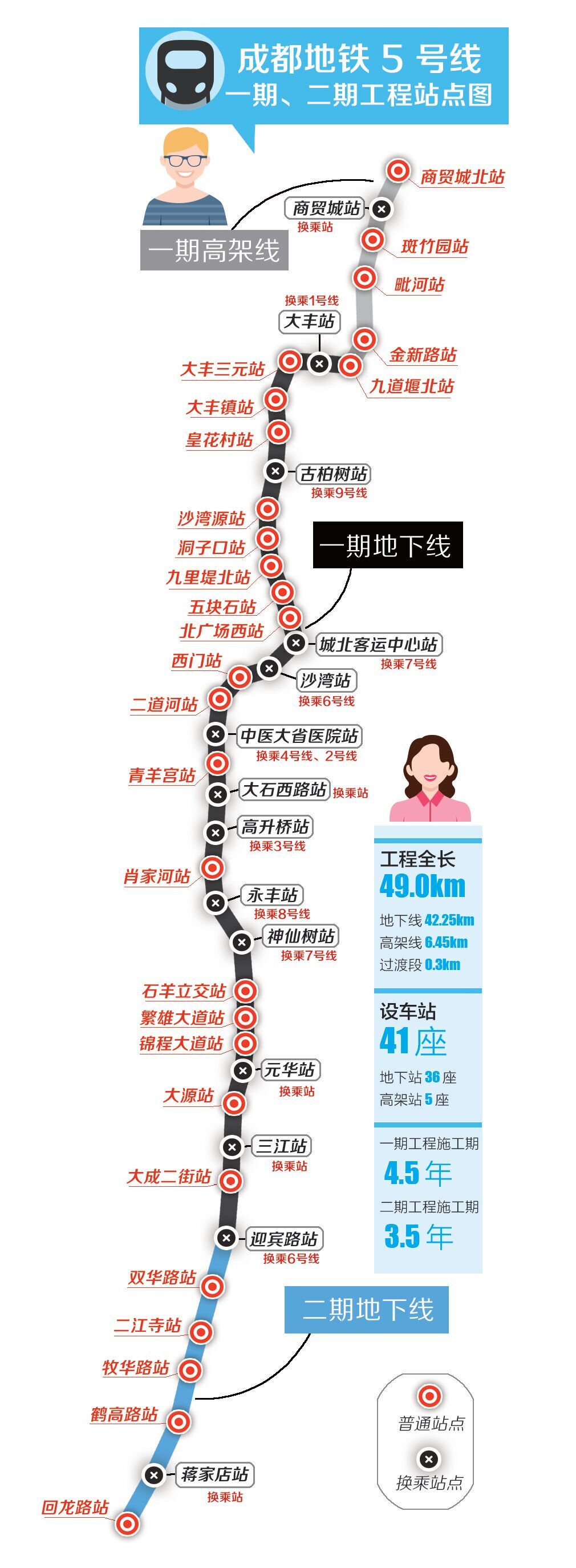 记者了解到,成都地铁5号线一期、二期工程将设41个车站,其中一期工程共设车站35座,地下站30座,高架站5座;二期工程设地下站6座。