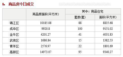 截至2015年6月2日23:00,成都市城区(含高新区、华阳街道、中和街道)商品房成交(备案)面积43544.03平米,其中商品住宅成交(备案)361套,商品住宅成交(备案)面积34543.02平米。二手房成交(备案)总面积35905.33平米,其中二手住宅成交(备案)305套,二手住宅成交(备案)面积29645.89平米。