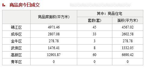 截至2015年6月7日23:00,成都市城区(含高新区、华阳街道、中和街道)商品房成交(备案)面积22435.6平米,其中商品住宅成交(备案)149套,商品住宅成交(备案)面积15470.85平米。二手房成交(备案)总面积0平米,其中二手住宅成交(备案)0套,二手住宅成交(备案)面积0平米。