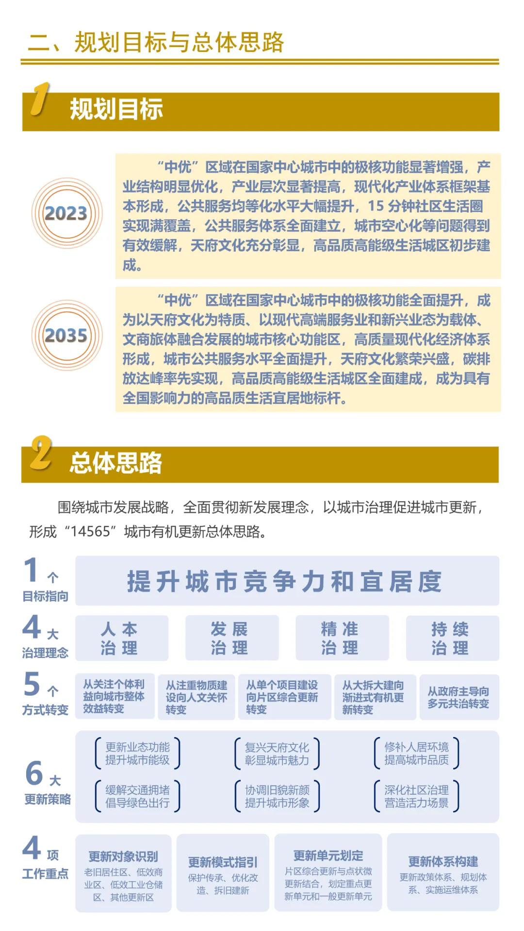 至2035年,“中优”区域全面建成高品质高能级生活城区,形成高质量现代化经济体系,全面提升城市公共服务水平,繁荣兴盛天府文化,率先实现碳排放、碳达峰,成为以天府文化为特质、以现代高端服务业和新兴业态为载体、文商旅体融合发展的城市核心功能区和具有全国影响力的高品质生活宜居地标杆。