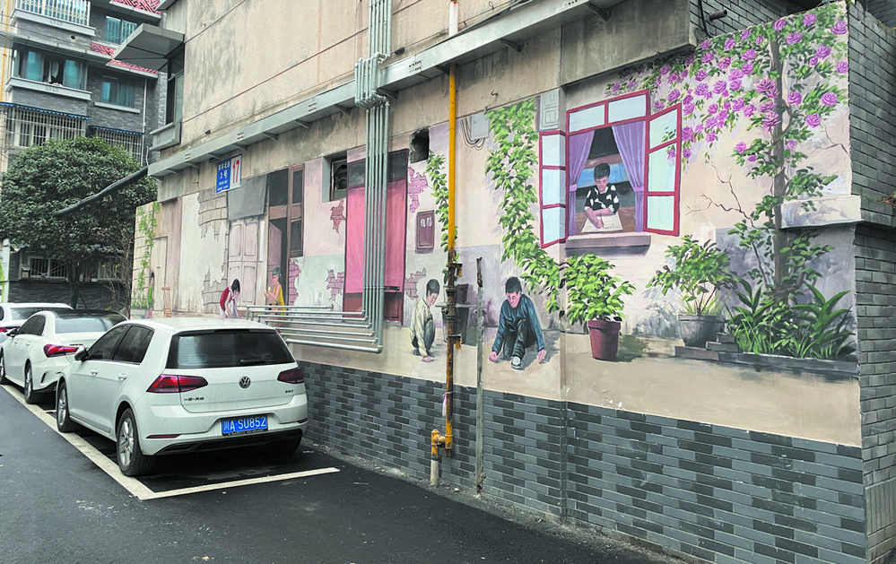 干净整洁的小区道路、整齐崭新的自来水管、错落有致的小区绿化、创意十足的墙绘图案……