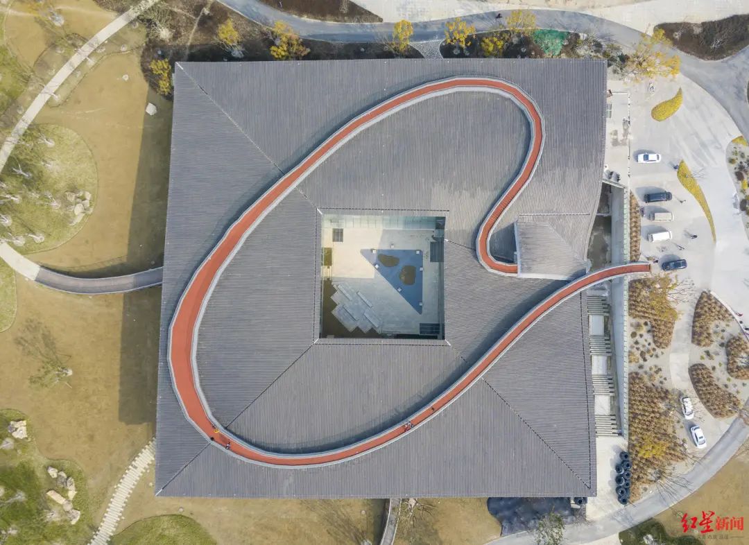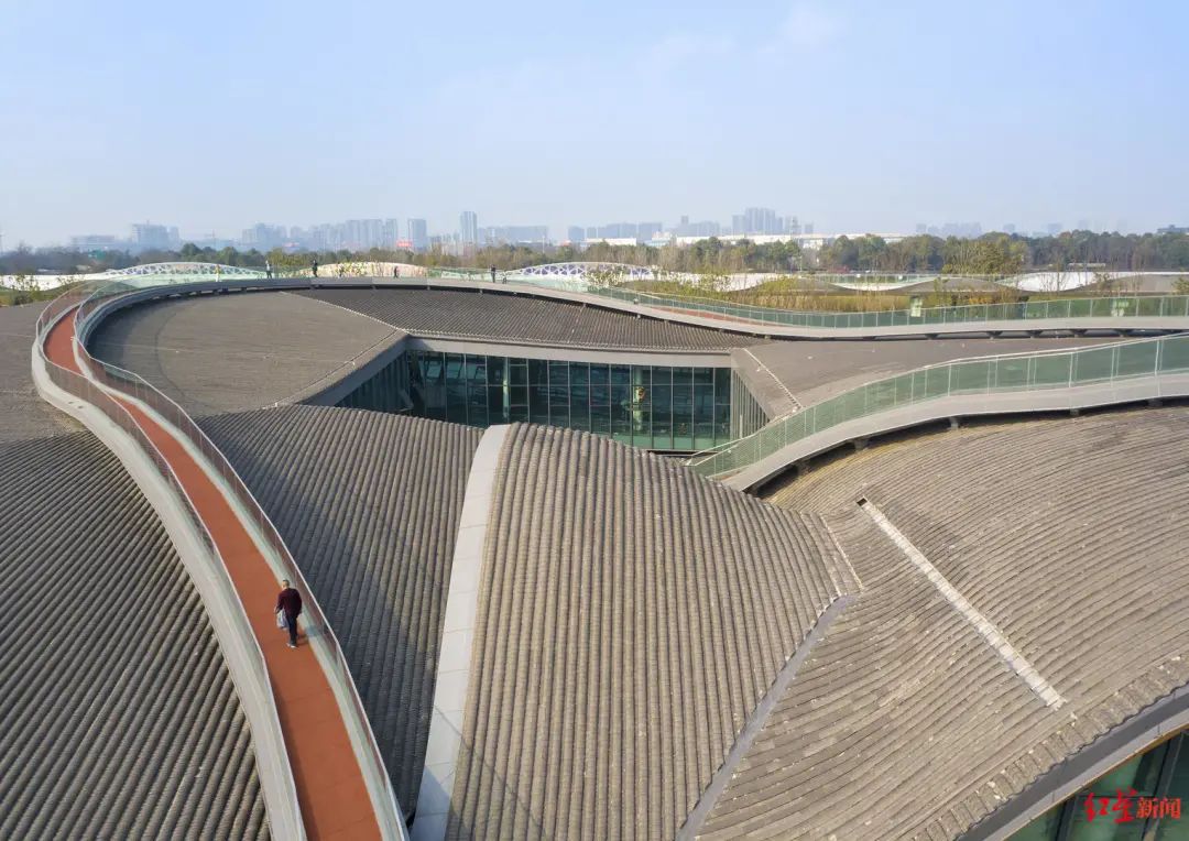 作为公园“一点-四道-八景”景观结构中的点睛之笔,“起风的院子”是杨磊推荐的必去之地。从地面沿着栈道登上“起风的院子”,古香古色、似波浪起伏的黑瓦屋顶尽收眼底。“曲面的屋顶是为了模拟风吹过的痕迹。”杨磊表示,建筑的外围都是透明的玻璃幕墙。夜晚灯光打在屋顶上,站在远处看,屋顶似漂浮在空中一般。为了增加体验感,设计团队在屋顶增加了一条类似心形的红色栈道。“栈道随屋顶起伏,大约有10米的高差。”杨磊笑着说,起风的时候走在上面,可能会有飞檐走壁的感觉。同时栈道本身也设计了灯带,晚上亮灯后非常飘逸。