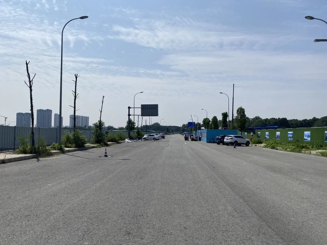 从正在打通的成都市郫都区万福二街转入盛发街,可以看到,长约1公里的道路早已建成,路面未画交通标线,道路两边的路灯路牌也已经设置,道路两边杂草丛生,路面却与新建道路并无二样。