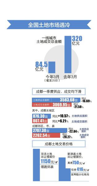 与国内多地土地市场一样,成都土地市场也备显冷清。四川中原地产提供的数据显示,第一季度,成都市土地供应总面积3583.68亩,与去年同期相比下降16.69%;土地总成交面积3069.95亩,与去年同期相比下降21.58%。