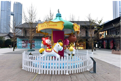 此次,成都远洋太古里为成都市民特别推出的13组主题装置错落分布于整个购物街区的三大广场及标志性建筑群落中,在传统与现代交汇的独特风格里,筑就童话与现实的碰撞,展示拥挤城市中低密度空间带来美学上的视觉反差。除了位于东广场的主装置《时间》,横跨两层楼的巨型装置《心愿》也创造了本次展览的最“高”纪录,高达8米的装置采用“叠叠乐”的形式,与国际知名艺术家Jenny Pickford专门为成都创造的艺术品——“大花”形成了有趣的互动;而坐落于漫广场的《旋转木马》则是阿狸和朋友们最热爱的童话乐园,随着音乐缓缓转动,在成都远洋太古里不一样的天空下,慢摇出心中最柔软的旋律。