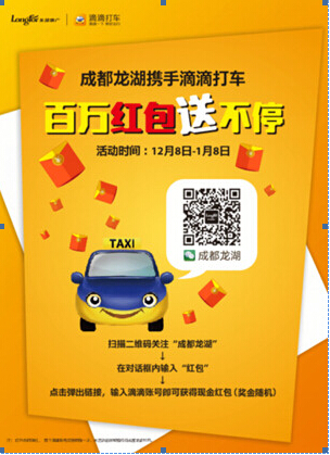 龙湖集团成都公司也在这重大节点来临前,向全城派发百万红包。12月8日—1月8日期间,只要关注成功“成都龙湖”微信,输入“红包”,再输入滴滴打车号,就可以欢乐抢红包了。