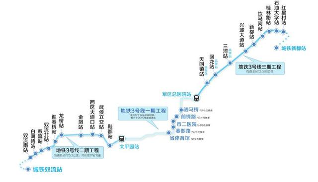 作为地铁3号线的南北延长线,成都地铁3号线二、三期工程共设置车站19座,其中二期工程设置地下站10座,三期工程设置车站9座。