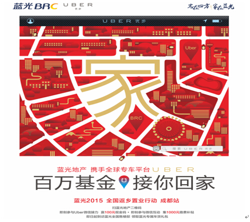 春运之际,成都蓝光地产携手全球专车平台Uber(优步)联合推出了“百万基金,接你回家”活动。市民只需根据领取Uber乘车优惠码,然后下载注册Uber账户,就可以享受专车到家的服务。据了解,Uber是一款领先的及时用车软件,起于美国,风靡于全球50多个国家的250多个城市,市值已超400亿美元。