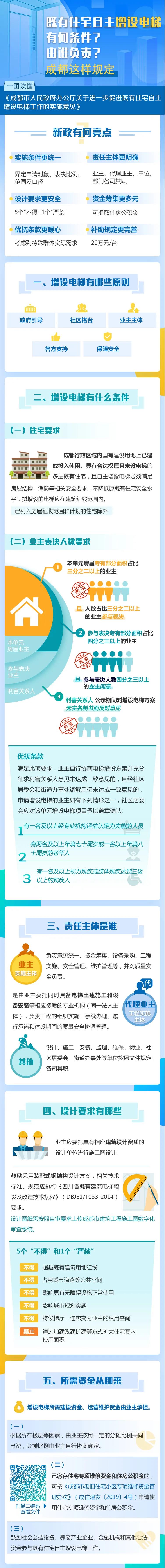 近日,《成都市人民政府办公厅关于进一步促进既有住宅自主增设电梯工作的实施意见》(以下简称《实施意见》)发布,旨在进一步完善既有住宅使用功能,提高老旧小区宜居水平。为让广大市民更好地了解《实施意见》,成都市政府门户网站协同市住建局制作图解,带你一图速览《实施意见》要点。