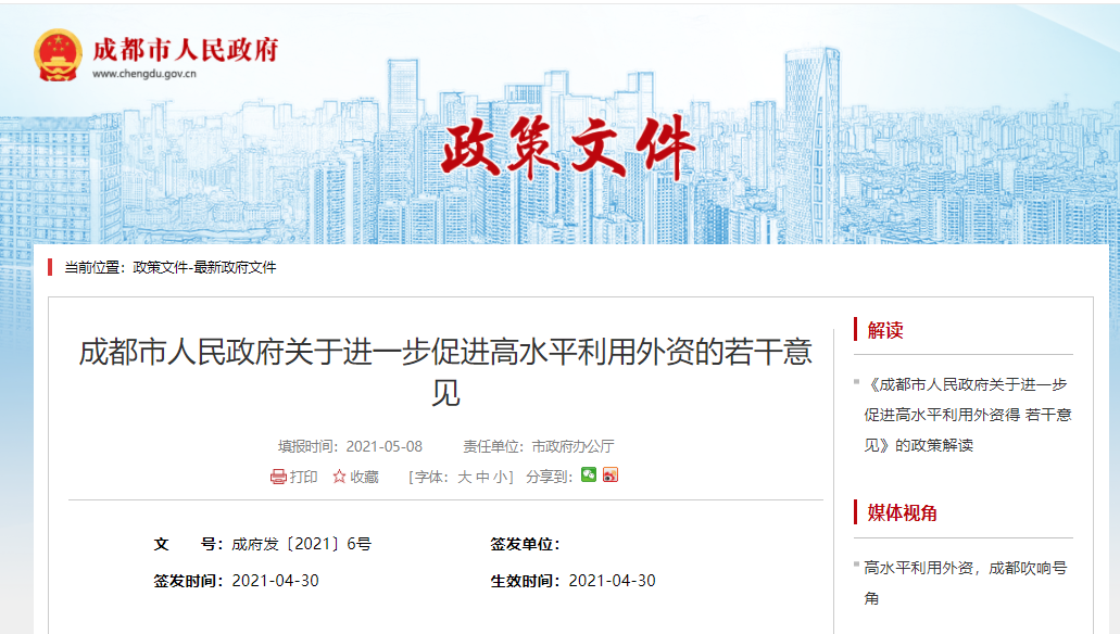 政事君从成都市人民政府网站获悉,日前,成都出台了《成都市人民政府关于进一步促进高水平利用外资的若干意见》(以下简称《意见》),包括15条政策措施,明确将进一步扩大成都市外资规模、优化外资结构、提升外资利用水平。