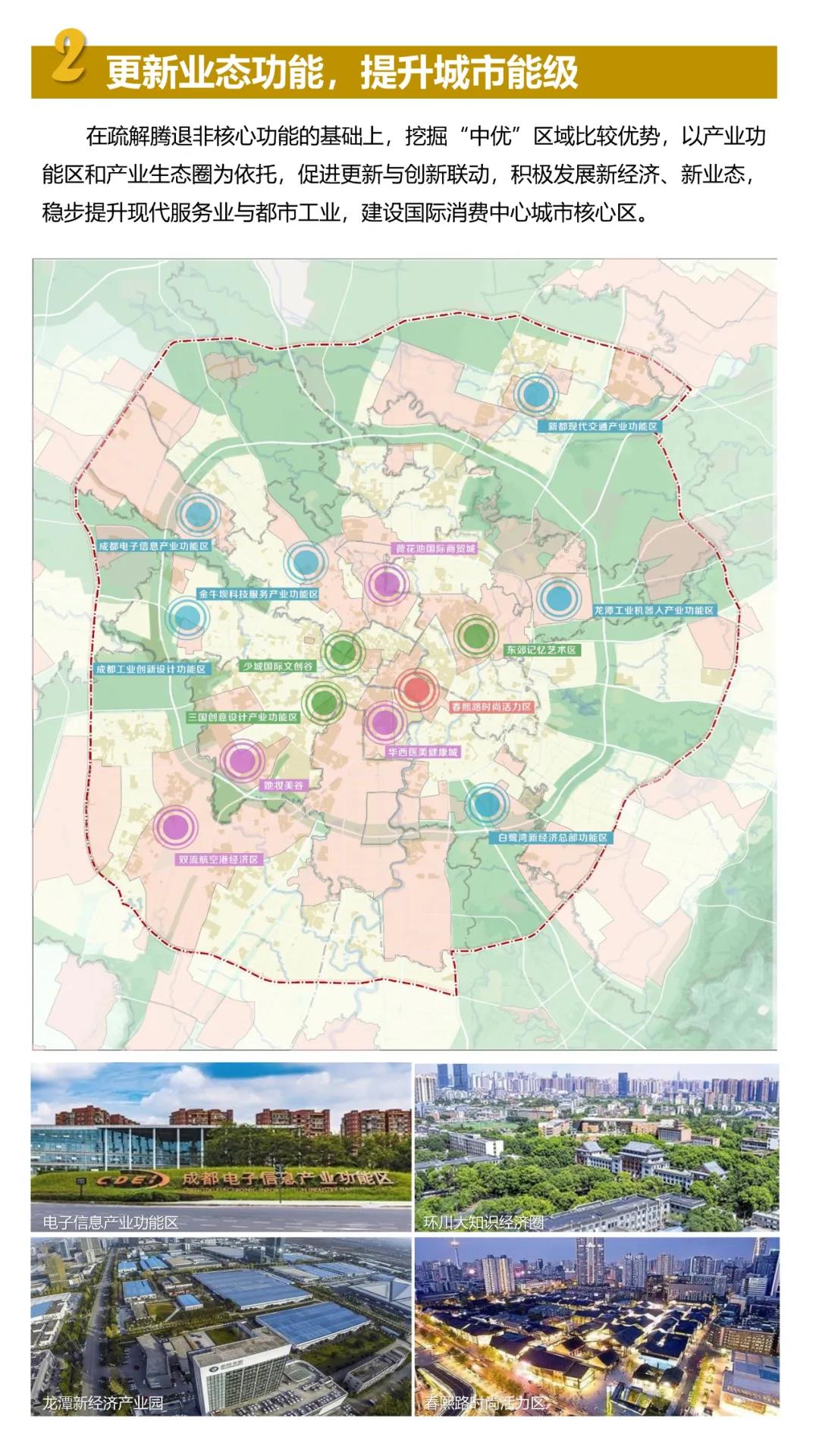 至2035年,“中优”区域全面建成高品质高能级生活城区,形成高质量现代化经济体系,全面提升城市公共服务水平,繁荣兴盛天府文化,率先实现碳排放、碳达峰,成为以天府文化为特质、以现代高端服务业和新兴业态为载体、文商旅体融合发展的城市核心功能区和具有全国影响力的高品质生活宜居地标杆。