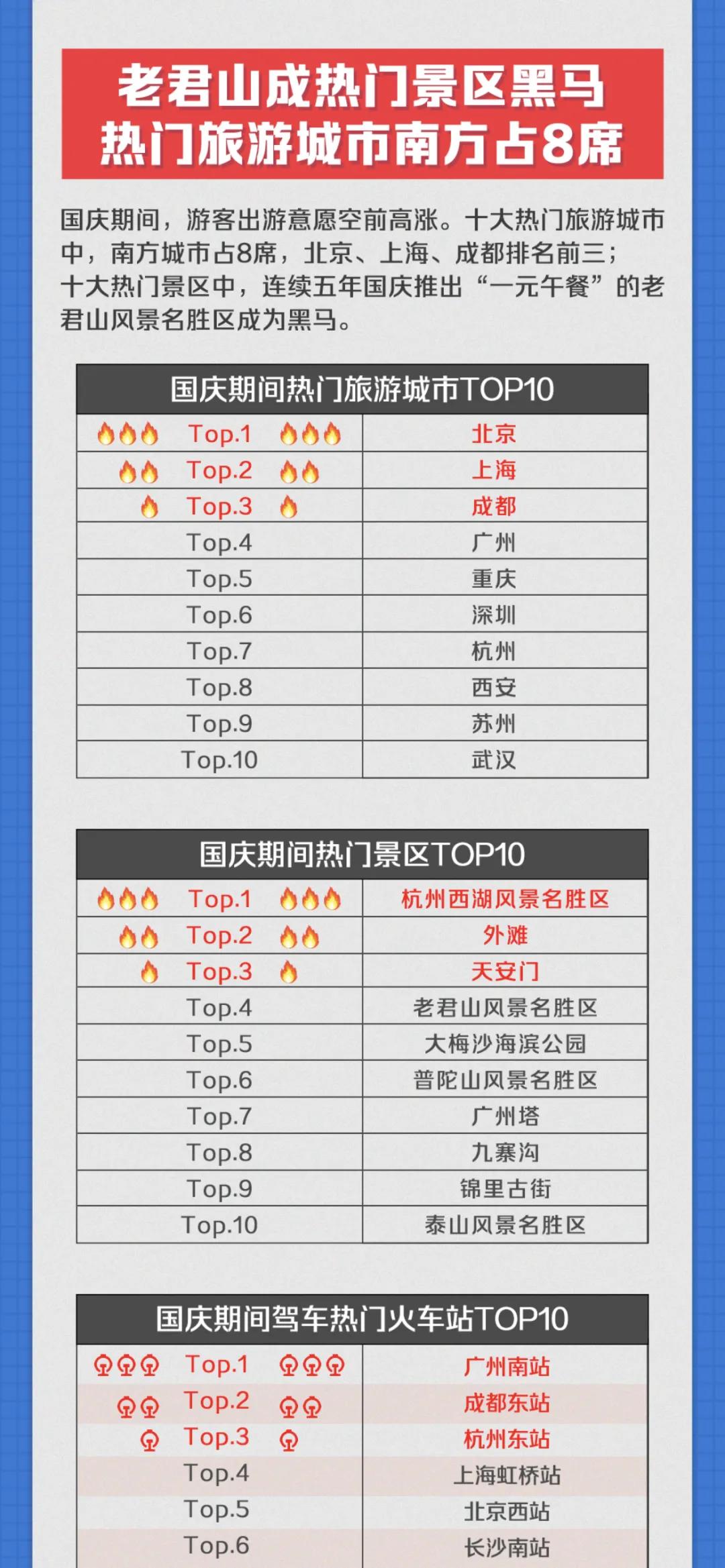 9月30日至10月5日,全国十大热门旅游城市分别为北京、上海、成都、广州、重庆、深圳、杭州、西安、苏州、武汉,其中八个都是南方城市。其中四川九寨沟和成都锦里成为全国十大热门景区,其余的分别为杭州西湖风景名胜区、外滩、天安门、老君山风景名胜区、大梅沙海滨公园、普陀山风景名胜区、广州塔等。