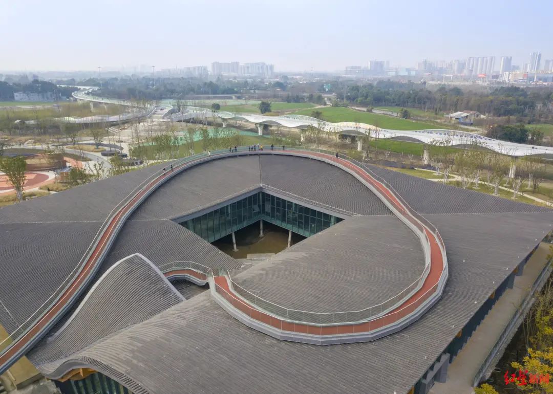 作为公园“一点-四道-八景”景观结构中的点睛之笔,“起风的院子”是杨磊推荐的必去之地。从地面沿着栈道登上“起风的院子”,古香古色、似波浪起伏的黑瓦屋顶尽收眼底。“曲面的屋顶是为了模拟风吹过的痕迹。”杨磊表示,建筑的外围都是透明的玻璃幕墙。夜晚灯光打在屋顶上,站在远处看,屋顶似漂浮在空中一般。为了增加体验感,设计团队在屋顶增加了一条类似心形的红色栈道。“栈道随屋顶起伏,大约有10米的高差。”杨磊笑着说,起风的时候走在上面,可能会有飞檐走壁的感觉。同时栈道本身也设计了灯带,晚上亮灯后非常飘逸。