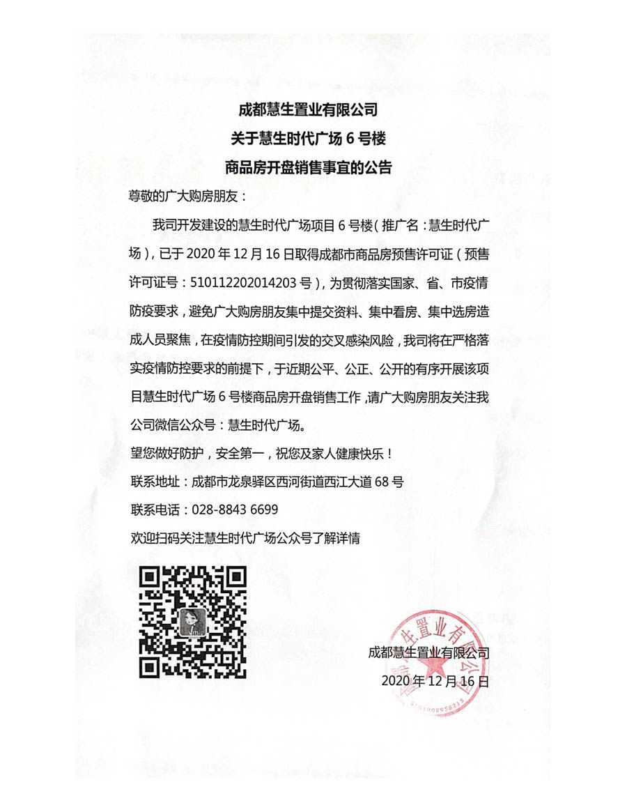 首页 > 最新项目预售公示 > 龙泉驿区 > 慧生时代广场