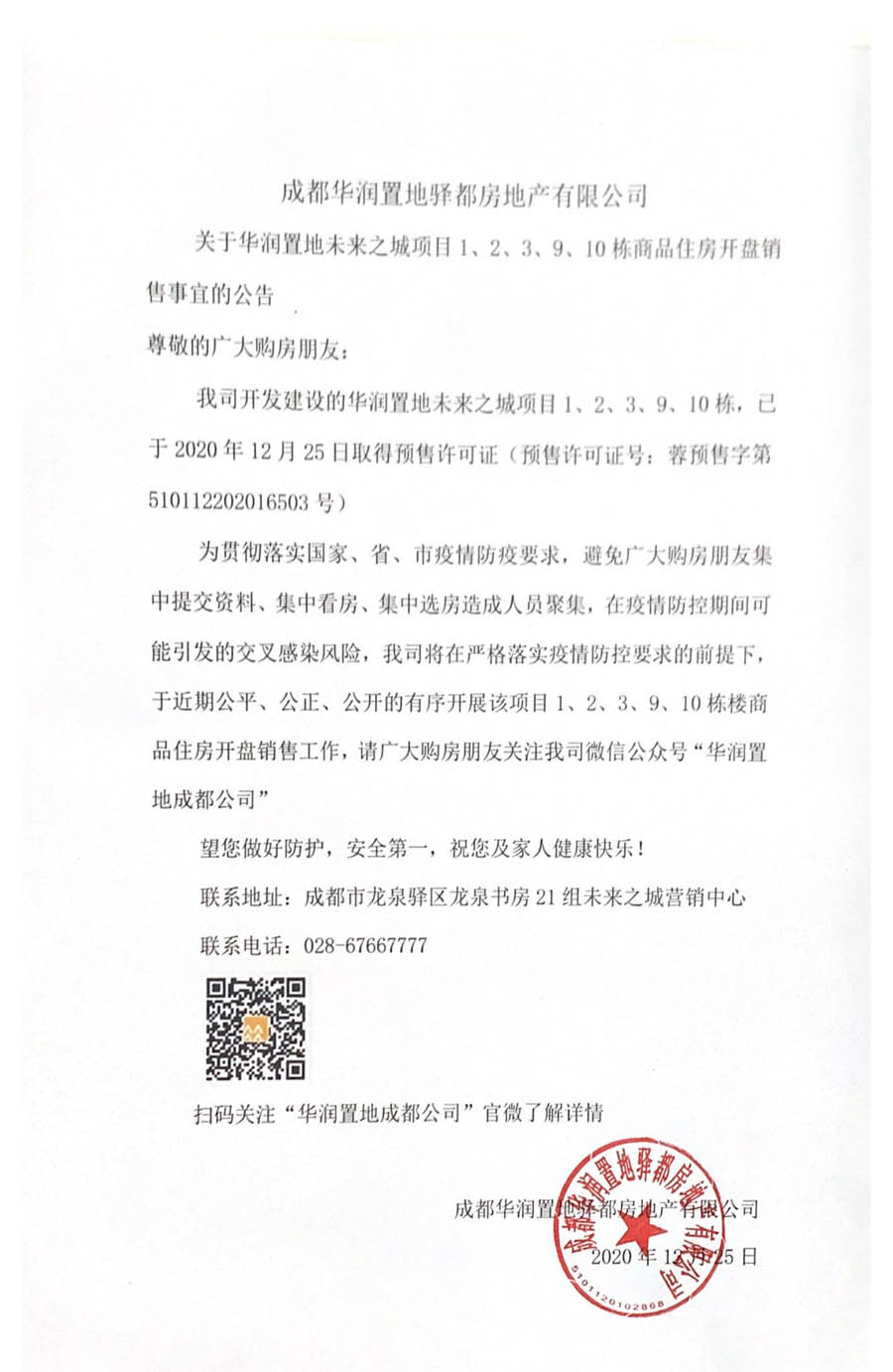 首页 > 最新项目预售公示 > 龙泉驿区 > 华润置地未来之城