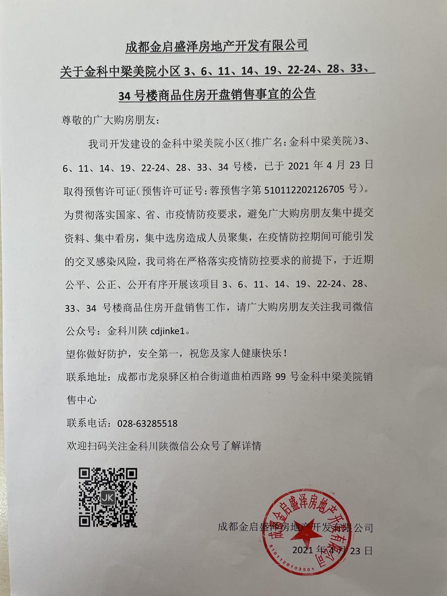首页 > 最新项目预售公示 > 龙泉驿区 > 金科中梁美院小区